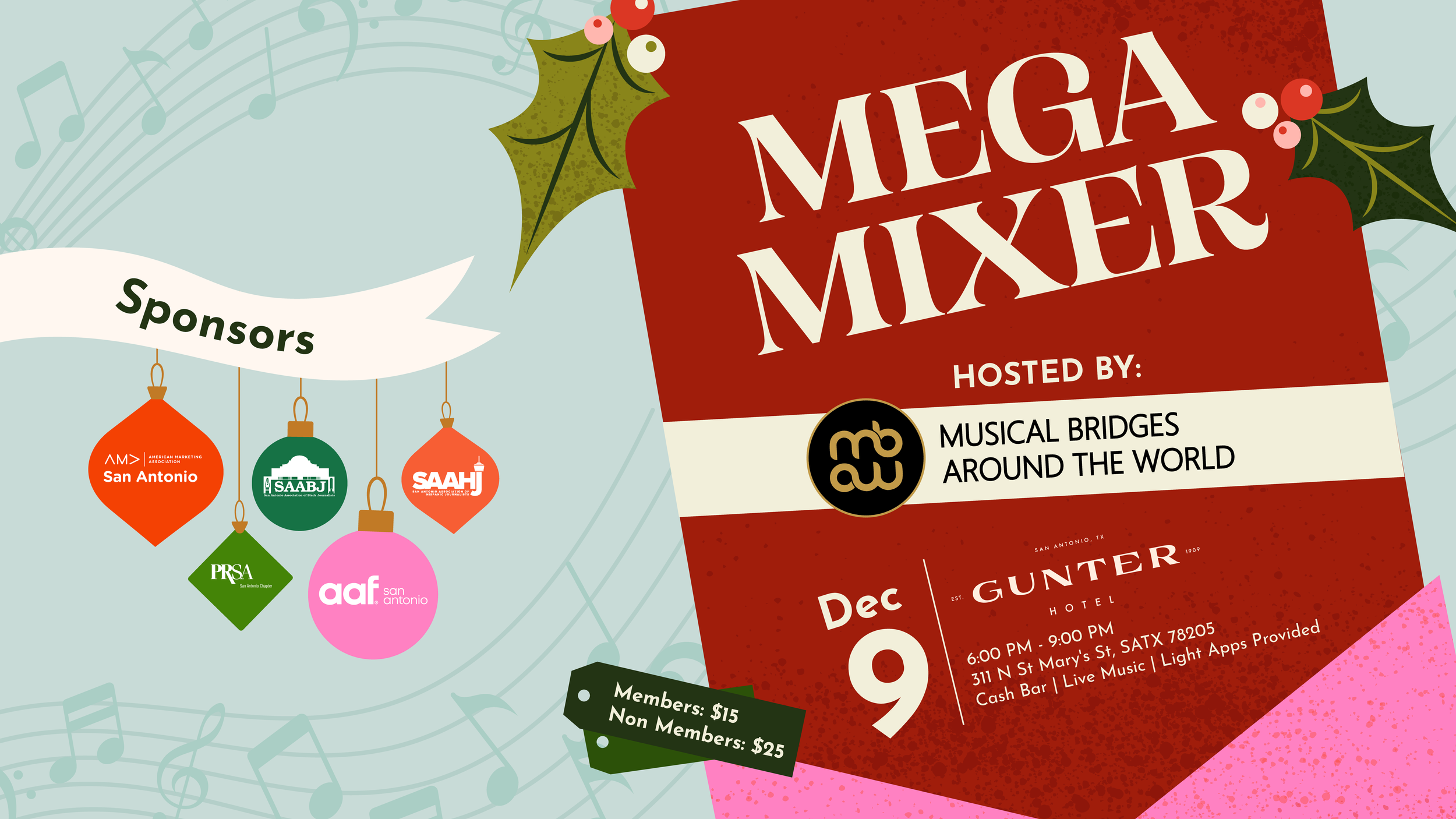 Join AAF, AMA, PRSA, SAABJ & SAAHJ for the 2025 Holiday MegaMixer! Hosted by Musical Bridges Around the World and The Gunter Hotel.